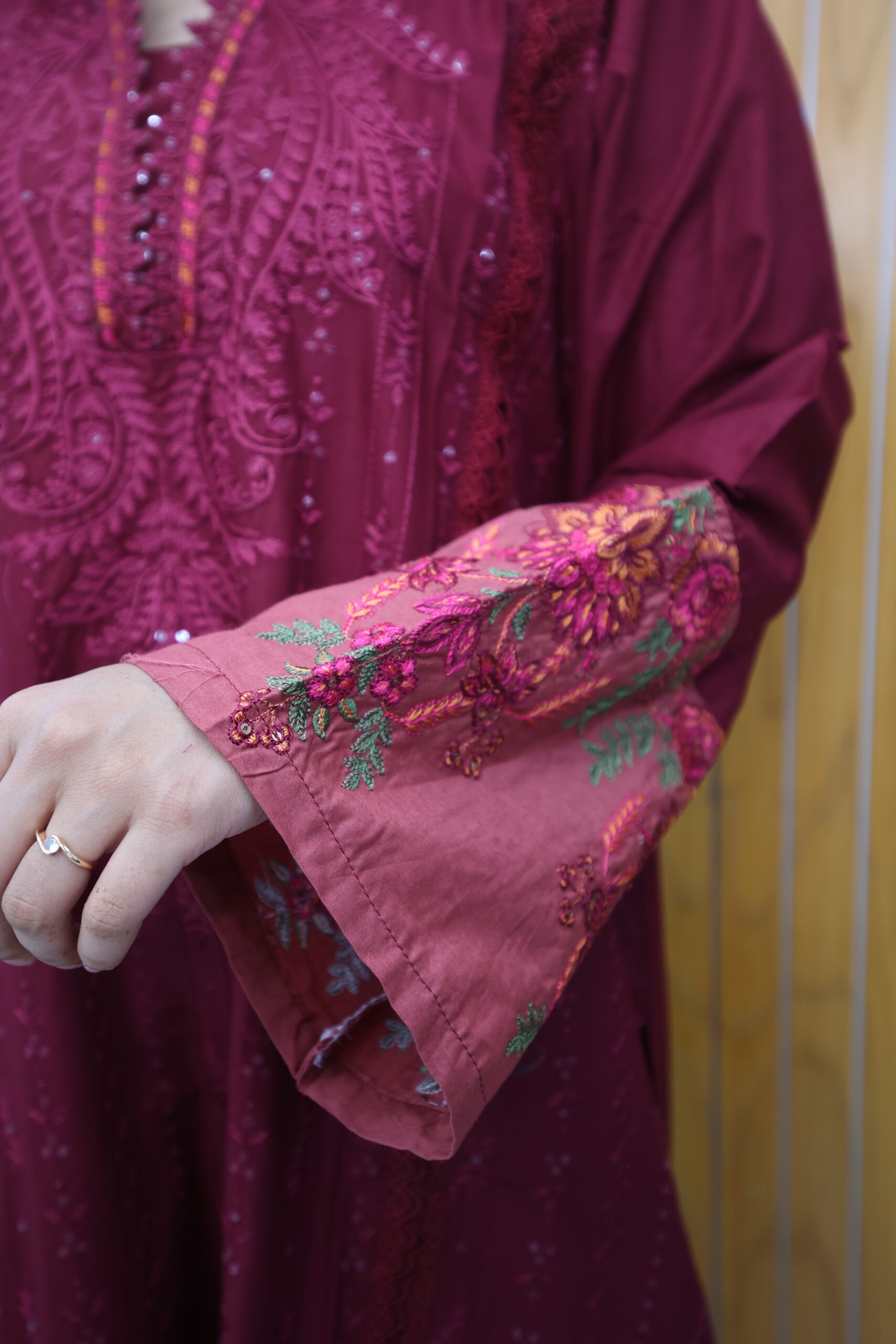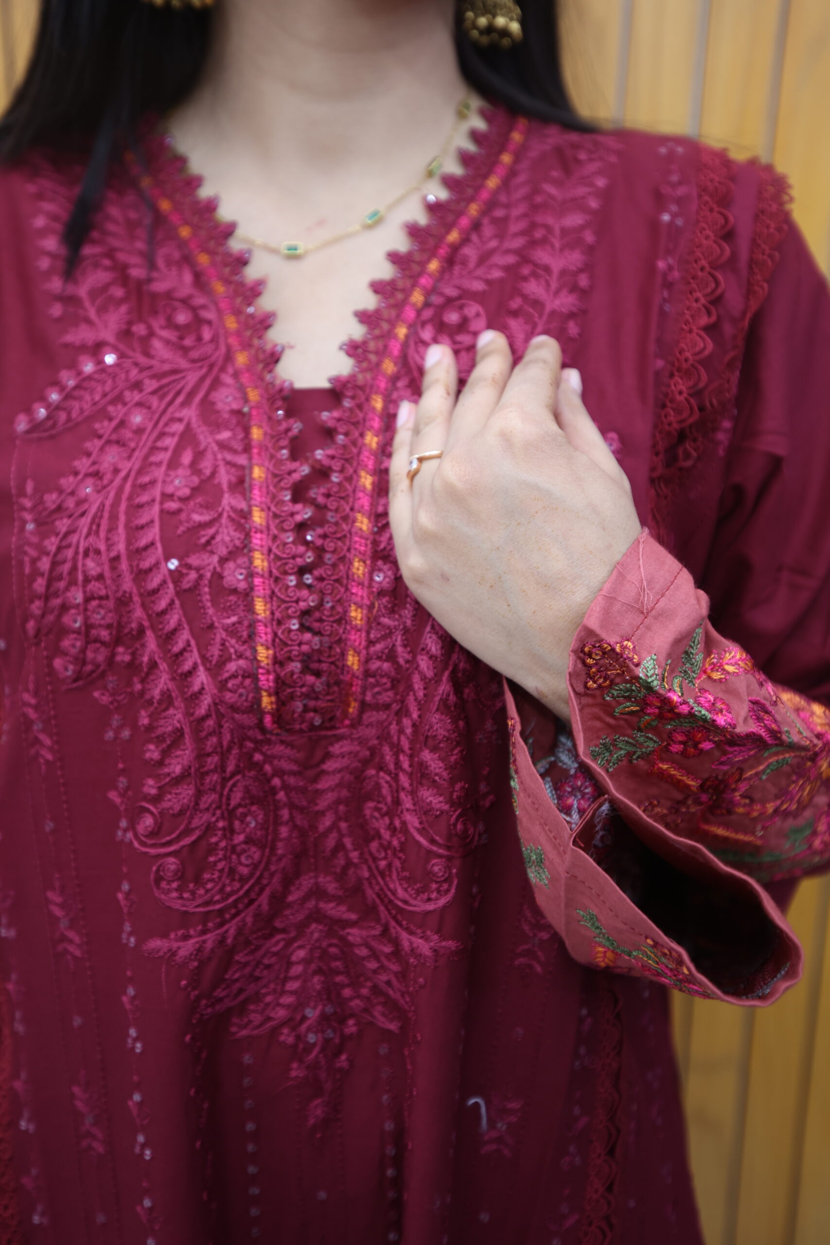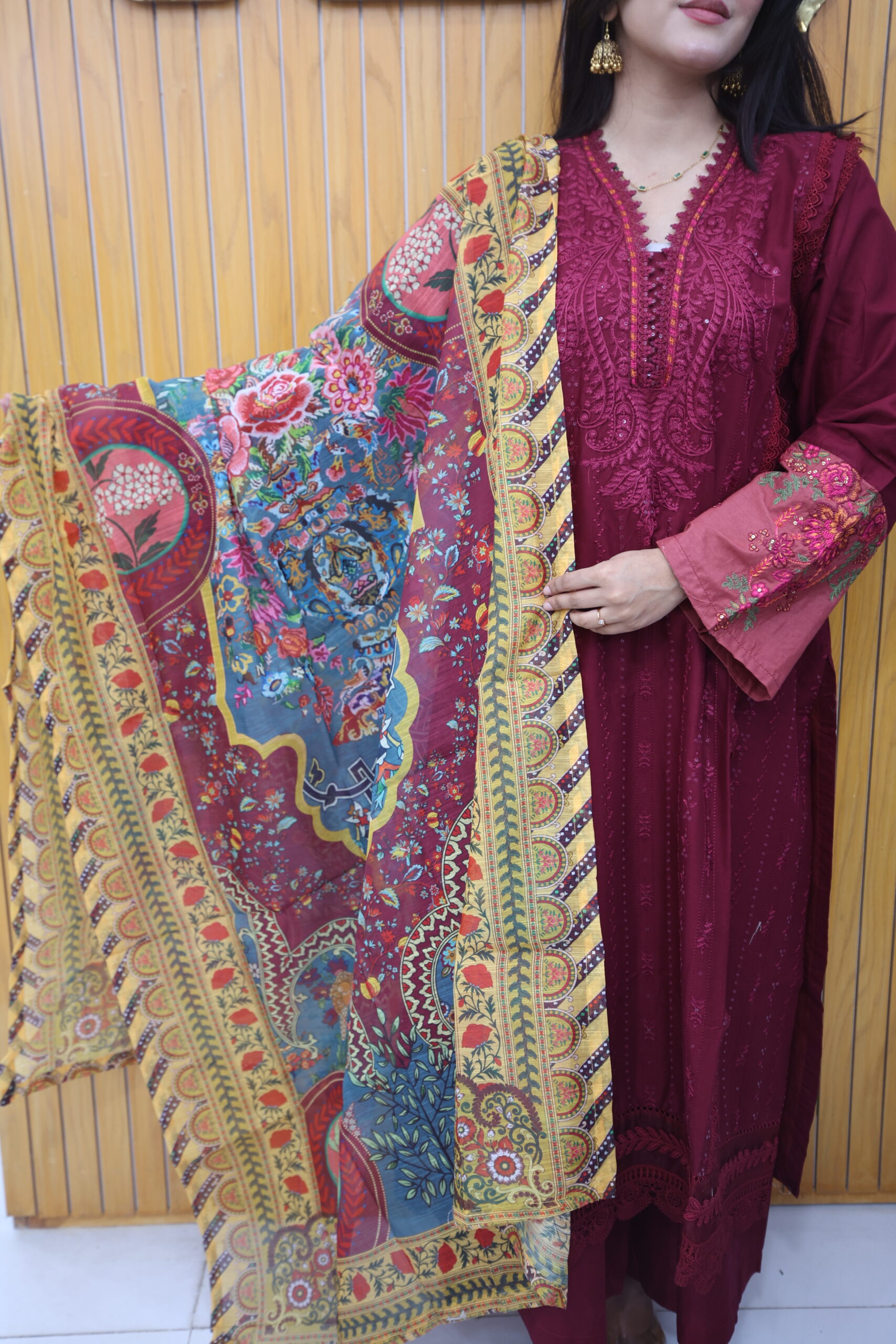 + Free ShippingEffortlessly elegant and timeless, this look blends tradition with modern sophistication. The ensemble features a flowing black outfit adorned with intricate floral prints in warm, earthy tones, beautifully complemented by detailed embroidery along the neckline and hem. The statement sleeves add a graceful touch, while the vibrant mustard dupatta with ornate borders introduces a striking contrast. Styled with sleek sunglasses and worn in a serene outdoor setting, this look captures confidence, poise, and contemporary charm—perfect for making an impression at both daytime gatherings and festive occasions.